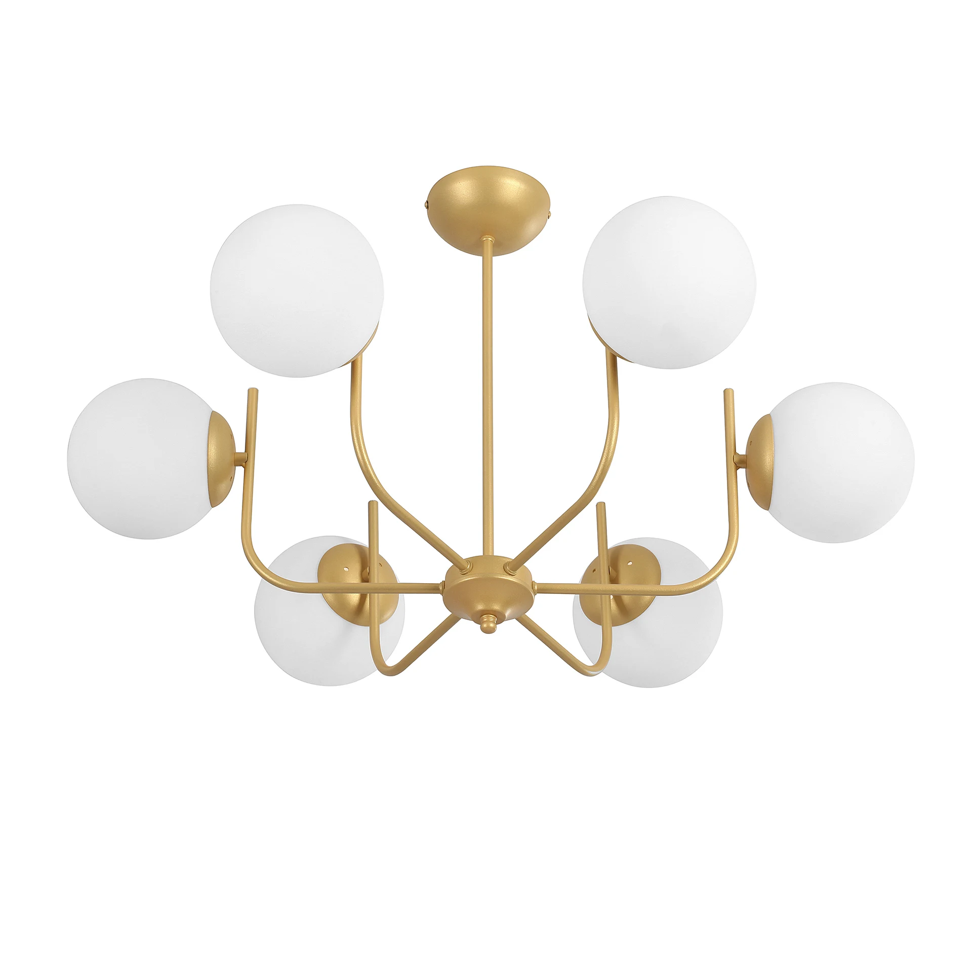Потолочная люстра Vitaluce V3957-8/6PL от Vitaluce — люстры. Материал — металл, цвет золото, плафон из стекла, цвет плафона молочный, форма плафона — шар. Модель имеет 6 ламп, цоколь E27, мощность 240 Вт, площадь освещения до 18 кв. м. Направление света — равномерное, крепление — планка. Габариты: высота 485 мм, ширина 800 мм, диаметр 800 мм. Коллекция V3957.