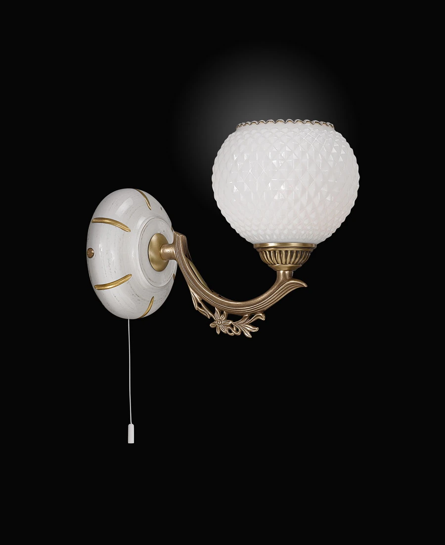 Настенное бра Reccagni Angelo 8655 A.8655/1 от Reccagni Angelo, подходит для гостиной, в стиле классика. Материал — латунь, цвет состаренная бронза, плафон из стекла, цвет плафона белый, форма плафона — шар. Модель имеет 1 лампу, цоколь E27, мощность 60 Вт, площадь освещения до 3 кв. м. С выключателем, поддержка диммера, сонетка (шнурок). Степень защиты IP20. Габариты: высота 20 мм, ширина 200 мм. Коллекция 8655.