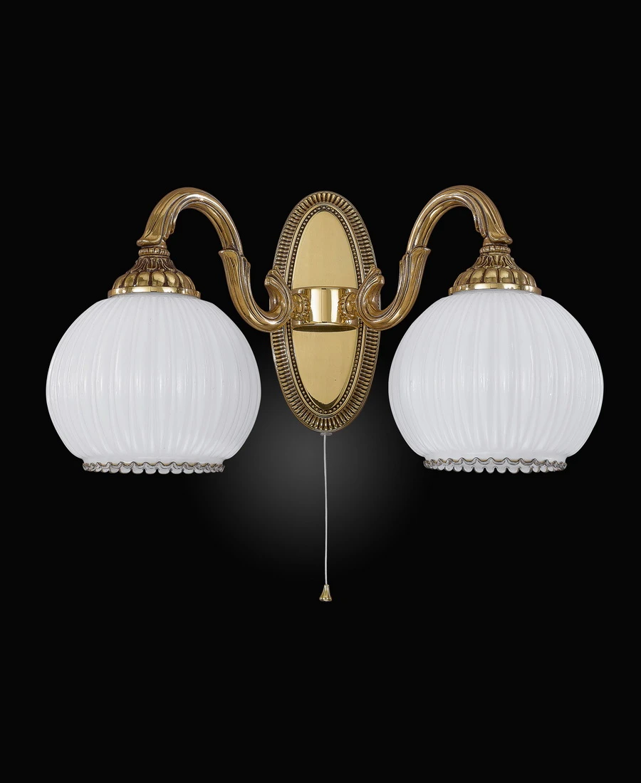 Настенное бра Reccagni Angelo 9300 A 9300/2 от Reccagni Angelo, подходит для гостиной, в стиле классика. Материал — латунь, цвет французское золото, плафон из стекла, цвет плафона белый. Модель имеет 2 лампы, цоколь E27, мощность 120 Вт, площадь освещения до 6 кв. м. Поддержка диммера, сонетка (шнурок). Степень защиты IP20. Габариты: высота 23 мм, ширина 37 мм. Коллекция 9300.