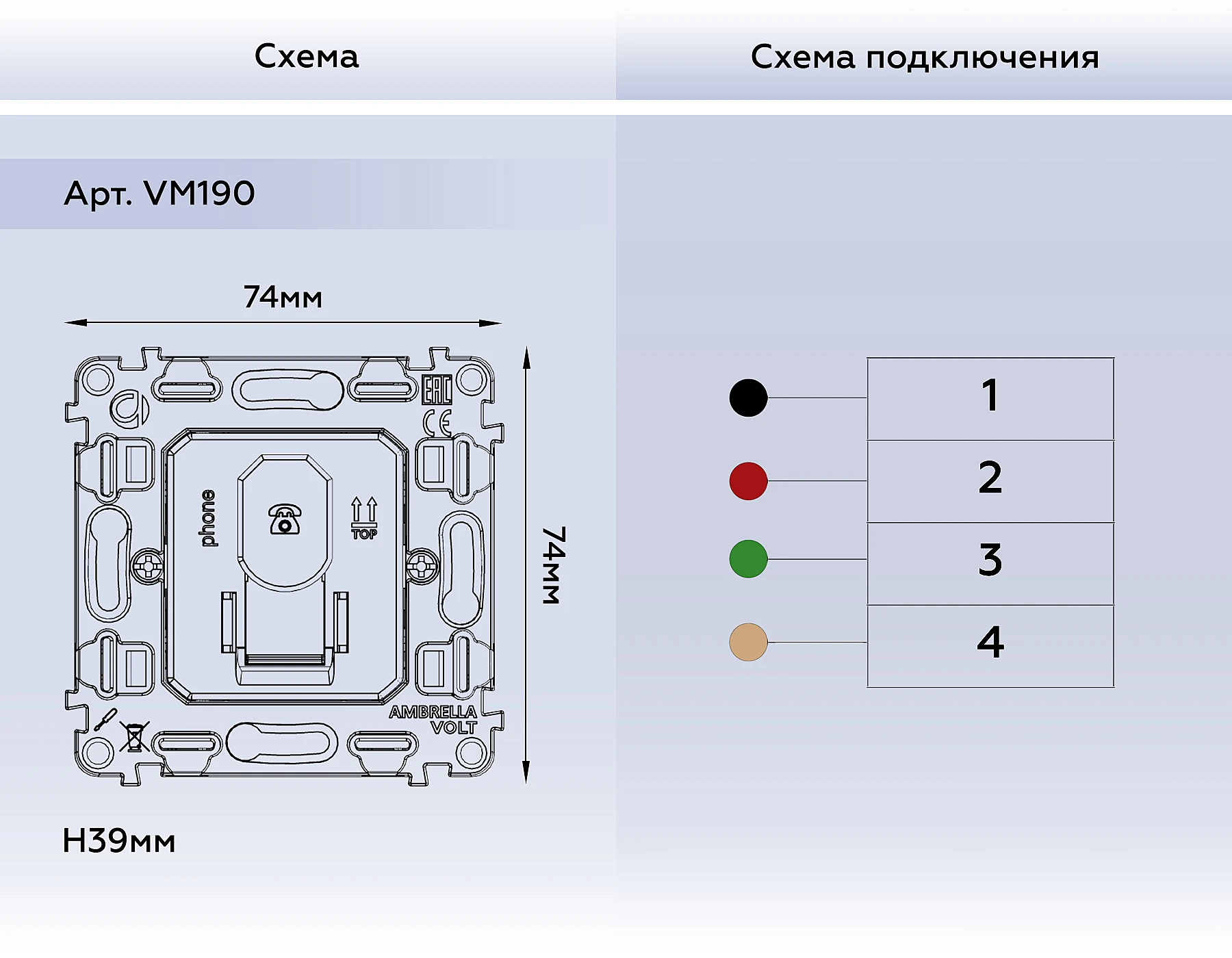 На Розетка Ambrella Volt QUANT VM190 от Ambrella Volt действует официальная гарантия производителя — от 2 лет и более. По вопросам гарантии в Беларуси обращайтесь по телефону +375 (29) 801 91 06 или на info@marketsveta.by.