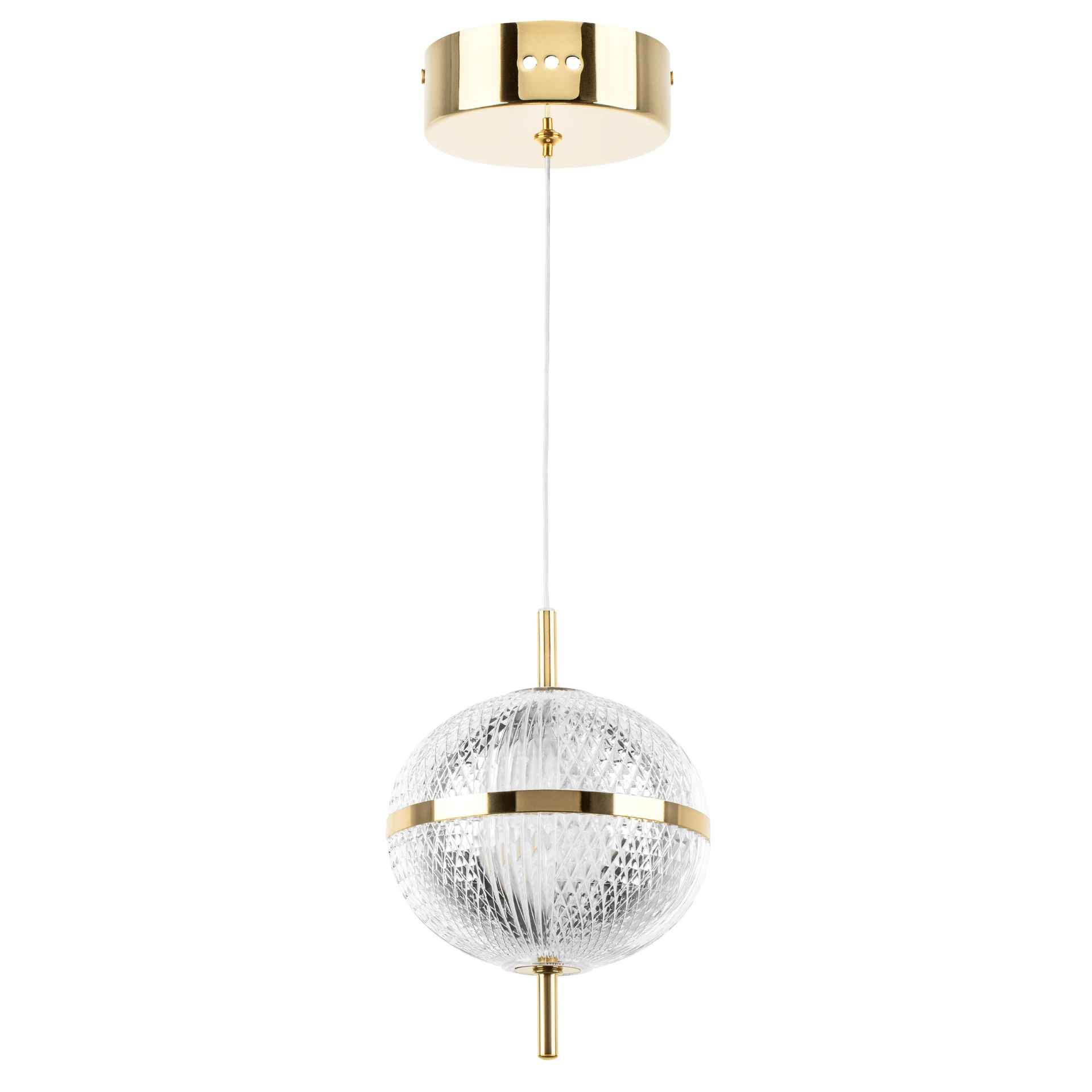 Светильник подвесной Lightstar Acrile 738023 от Lightstar, подходит для спальни, в стиле современный. Материал — металл, цвет золото, цвет плафона прозрачный, форма плафона — шар. Модель имеет 1 лампу, цоколь LED, мощность 7 Вт. Крепление — планка. Степень защиты IP20. Габариты: высота 1300 мм, ширина 140 мм, диаметр 140 мм. Коллекция Acrile, срок службы, ч — 20000, угол рассеивания — 120.