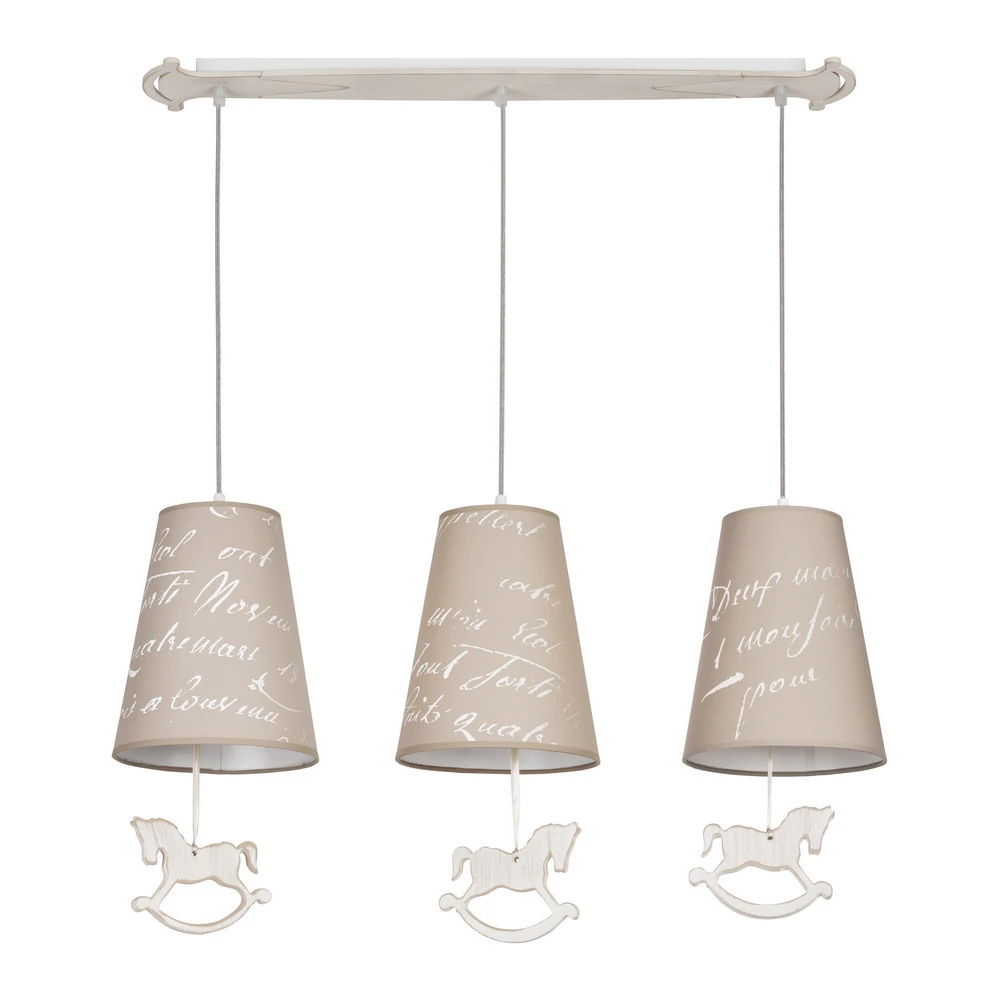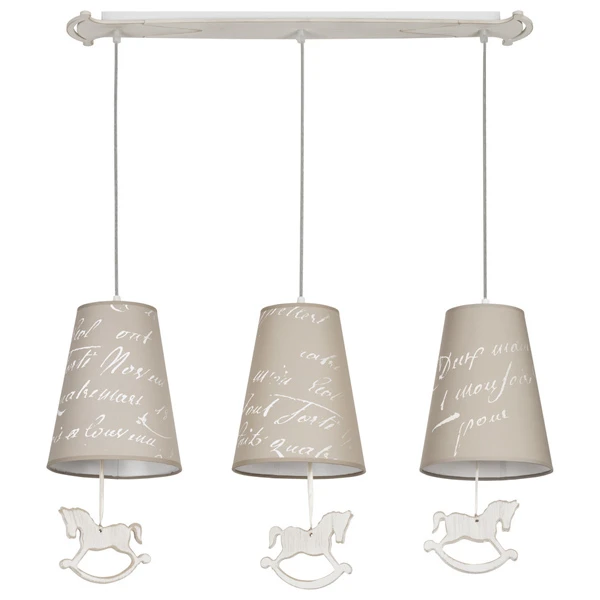 Светильник подвесной Nowodvorski Pony 6380 от Nowodvorski, подходит для детской, в стиле современный. Материал — металл, цвет бежевый, цвет плафона бежевый, форма плафона — круглый абажур. Модель имеет 3 лампы, цоколь E27, мощность 180 Вт. Степень защиты IP20. Габариты: высота 950 мм, ширина 740 мм. Коллекция Pony.