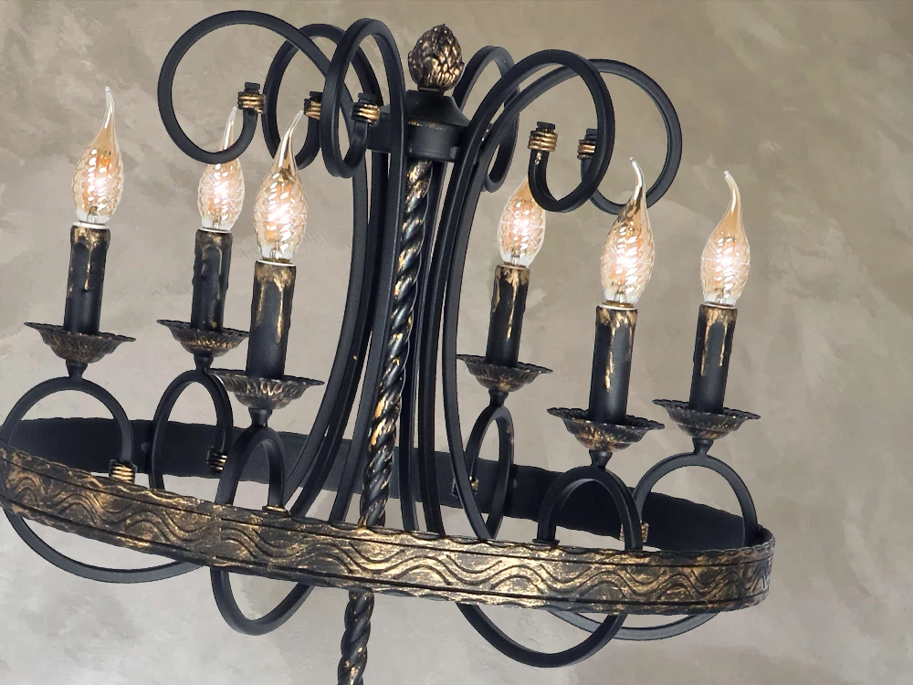 Торшер Розанофф RS109/5P от Розанофф, подходит для гостиной, в стиле кованые, кантри. Материал — металл, цвет черный, форма плафона — свечи. Модель имеет 5 ламп, цоколь E14, мощность 60 Вт. Ножной выключатель. Габариты: высота 16200 мм, ширина 550 мм, диаметр 550 мм. Коллекция Zoe.