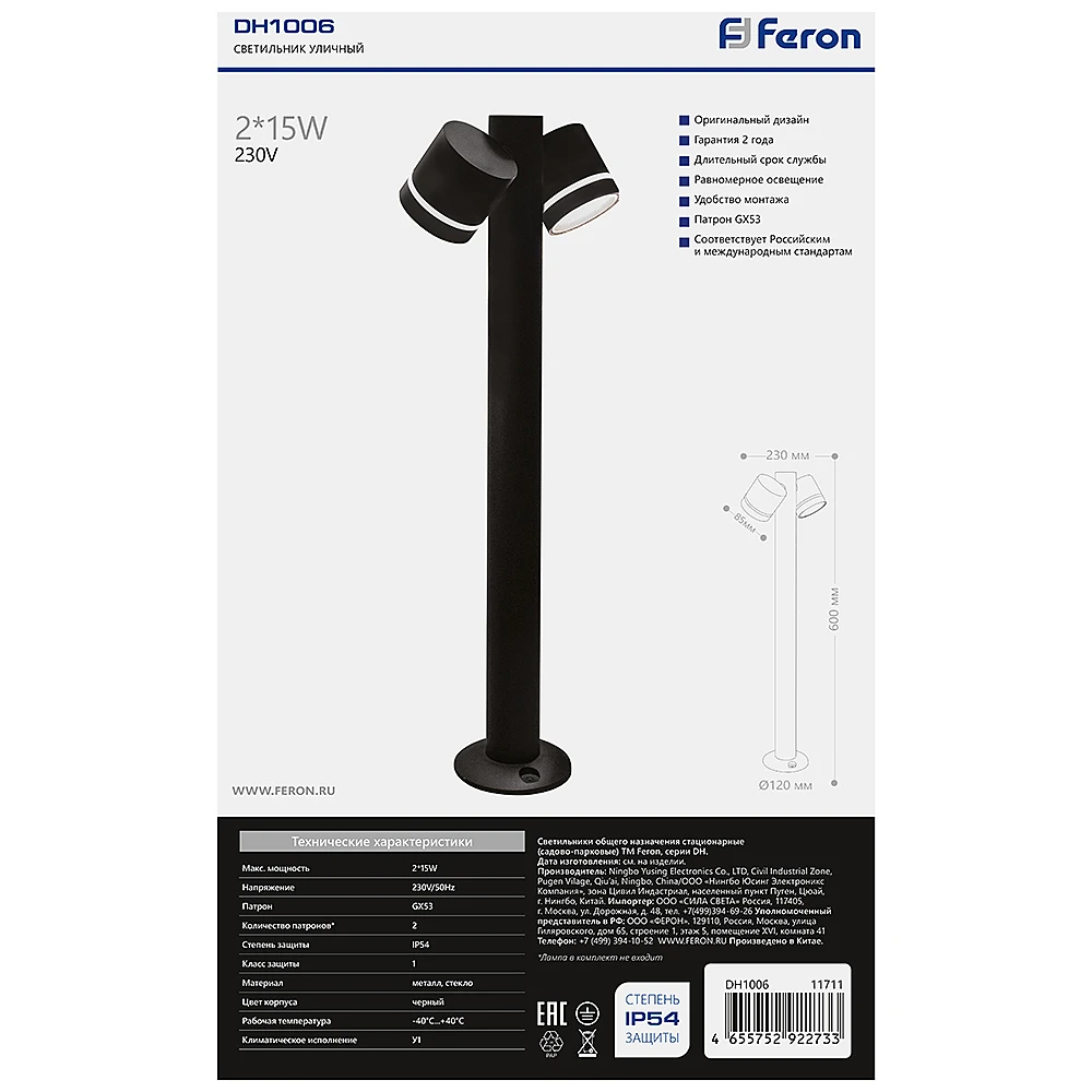 На Уличный наземный светильник Feron Рио 11711 от Feron действует официальная гарантия производителя — от 2 лет и более. По вопросам гарантии в Беларуси обращайтесь по телефону +375 (29) 801 91 06 или на info@marketsveta.by.