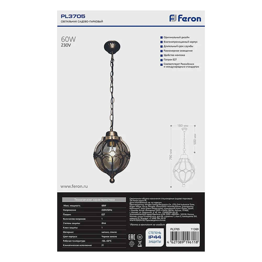 На Уличный подвесной светильник Feron Версаль 11369 от Feron действует официальная гарантия производителя — от 2 лет и более. По вопросам гарантии в Беларуси обращайтесь по телефону +375 (29) 801 91 06 или на info@marketsveta.by.