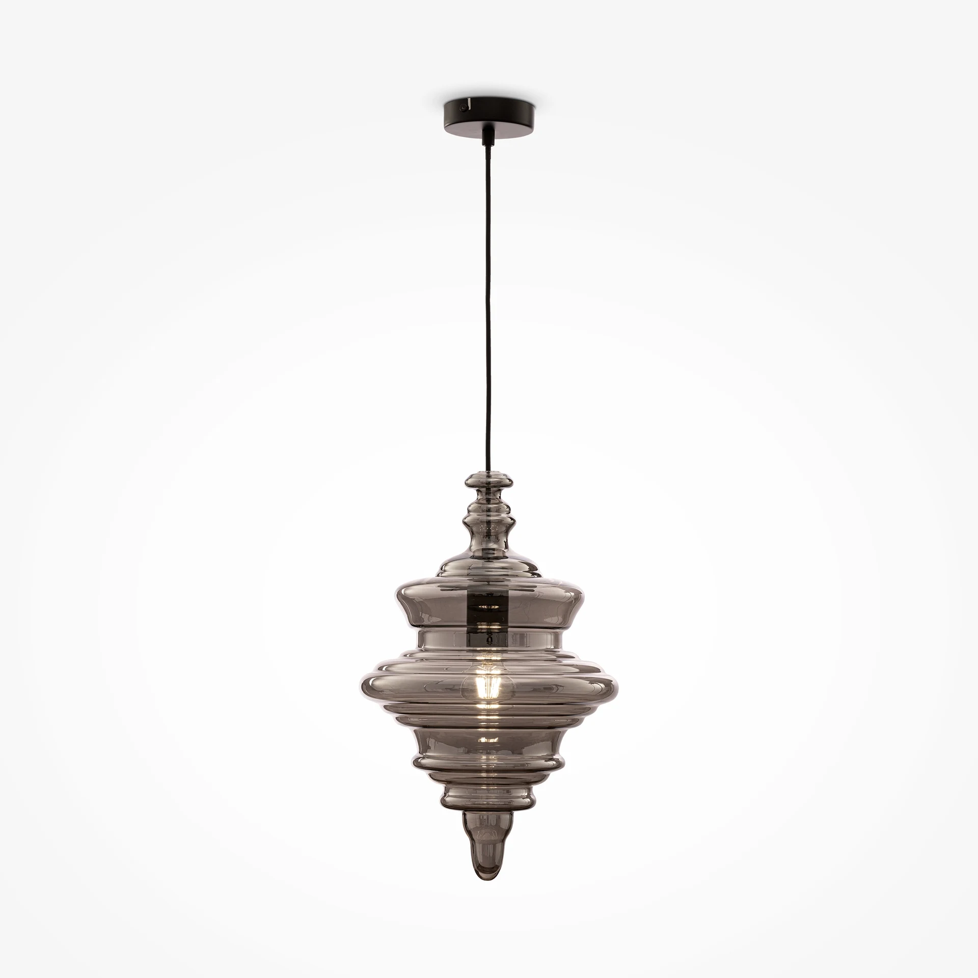 Светильник подвесной Maytoni Trottola P057PL-01B от Maytoni, подходит для гостиной. Материал — металл, цвет матовый черный, плафон из стекла, цвет плафона дымчатый, форма плафона — круглый плафон. Модель имеет 1 лампу, цоколь E27. Габариты: высота 1630 мм, ширина 280 мм, диаметр 280 мм.