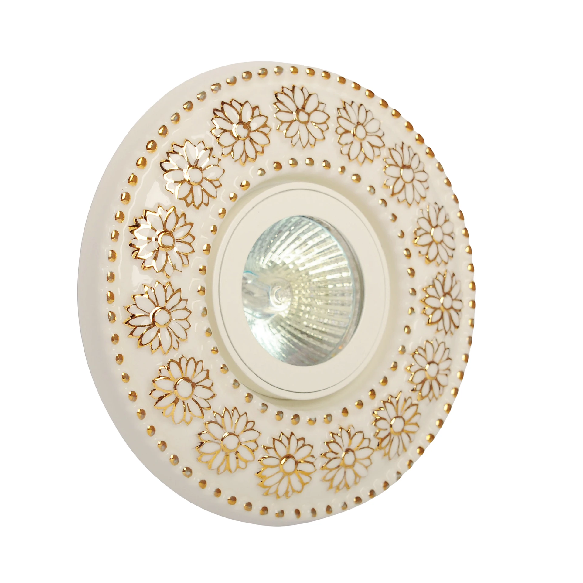 Встраиваемый светильник Abrasax 4006 от Abrasax, для установки на потолок. Материал — керамика, цвет белый, форма плафона — круглые. Модель имеет 1 лампу, цоколь GU10, мощность 40 Вт, площадь освещения до 3 кв. м. Степень защиты IP20. Габариты: высота 20 мм, ширина 150 мм, диаметр 150 мм. Декор — узоры.