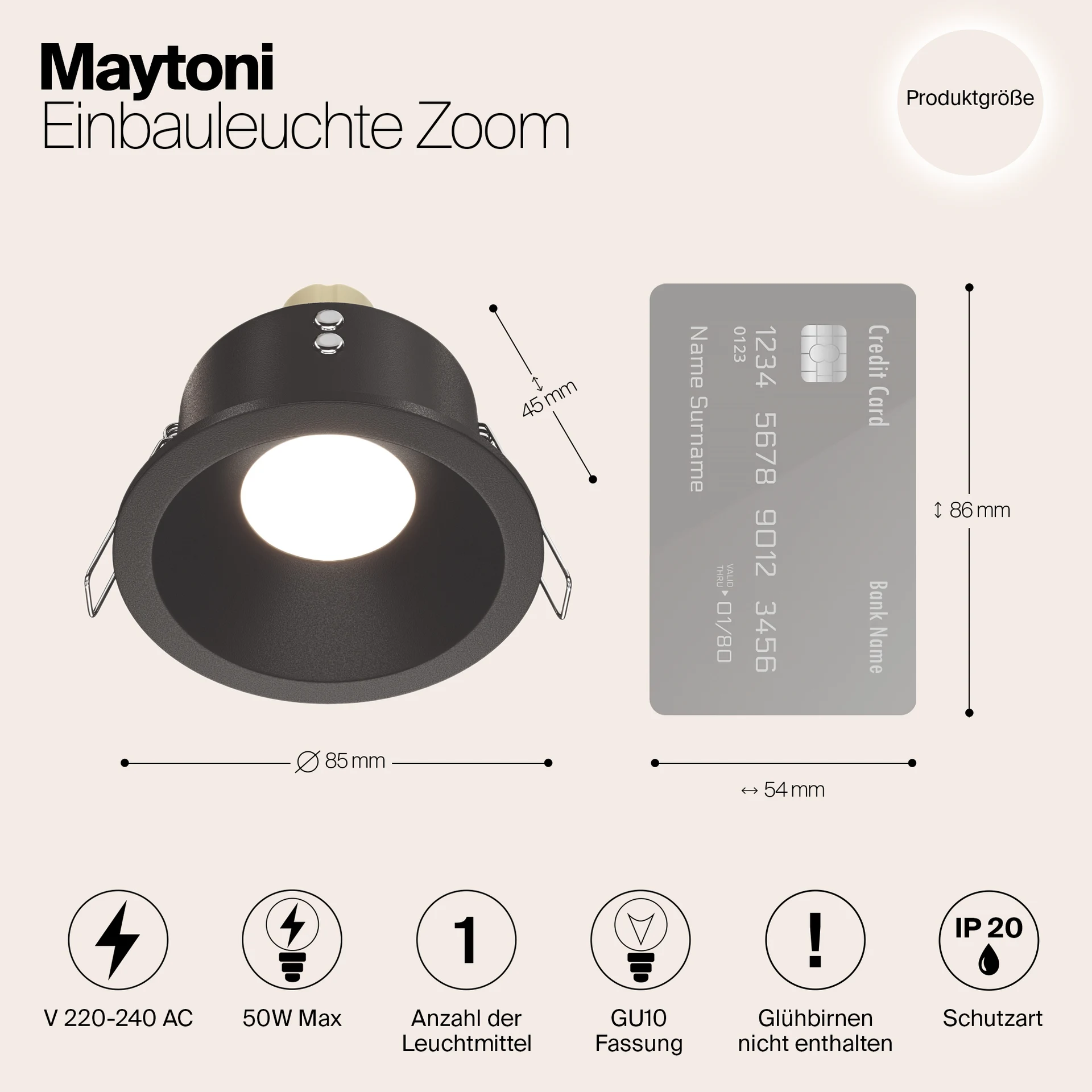 Встраиваемый светильник Maytoni Zoom DL032-2-01B от Maytoni, подходит для спальни, для ванной, в стиле современный. Материал — алюминий, цвет черный, форма плафона — круглые. Модель имеет 1 лампу, цоколь GU10, мощность 10 Вт. Степень защиты IP65. Габариты: высота 45 мм, ширина 85 мм, диаметр 85 мм. Коллекция Zoom.